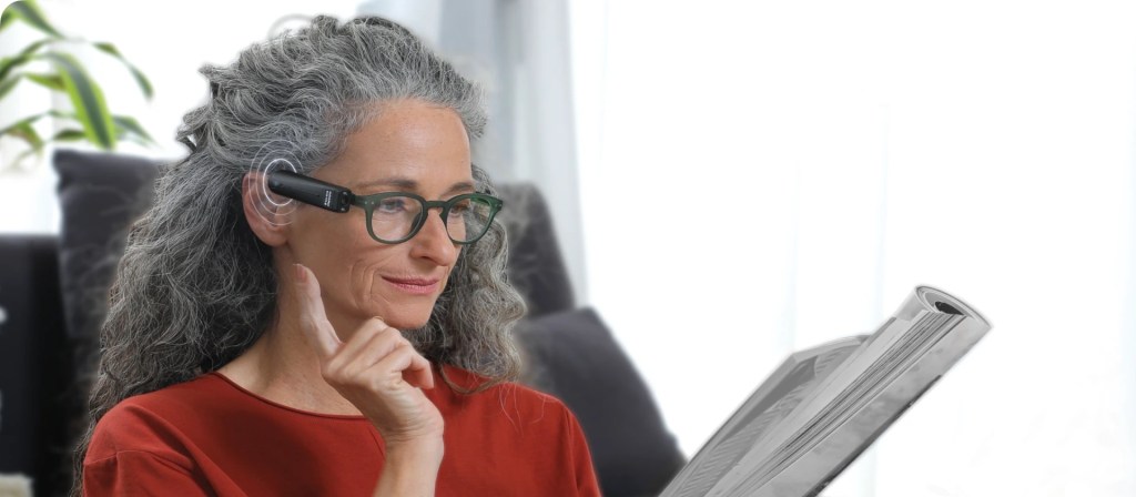 What exactly is the OrCam MyEye Pro? OrCam MyEye Pro ($4250 or $180/mo for 24 months) is exceptional at reading documents aloud. The OrCam MyEye Pro is about the size of the pack Juicy Fruit Gum and clips to the side of your glasses. It has a built-in 13 megapixel camera. The Orcam MyEye takes a picture of the printed page in a book, items on a menu, a letter received in the mail or even the screen of a computer or tablet. The OrCam MyEye Pro perform optical character recognition (OCR) on the picture. The OCR which happens on the Orcam device takes the print in the picture and renders it as e-text which then can be read out loud. The Orcam MyEye has a small speaker next to your ear so you can hear the text being read aloud. You may choose to pair the Orcam MyEye with a set of Bluetooth headphones or earbuds.